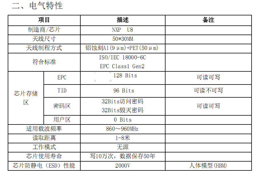 RFID服装电子标签参数: